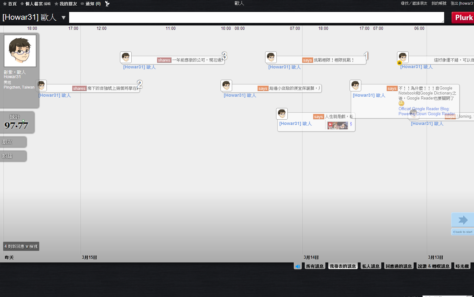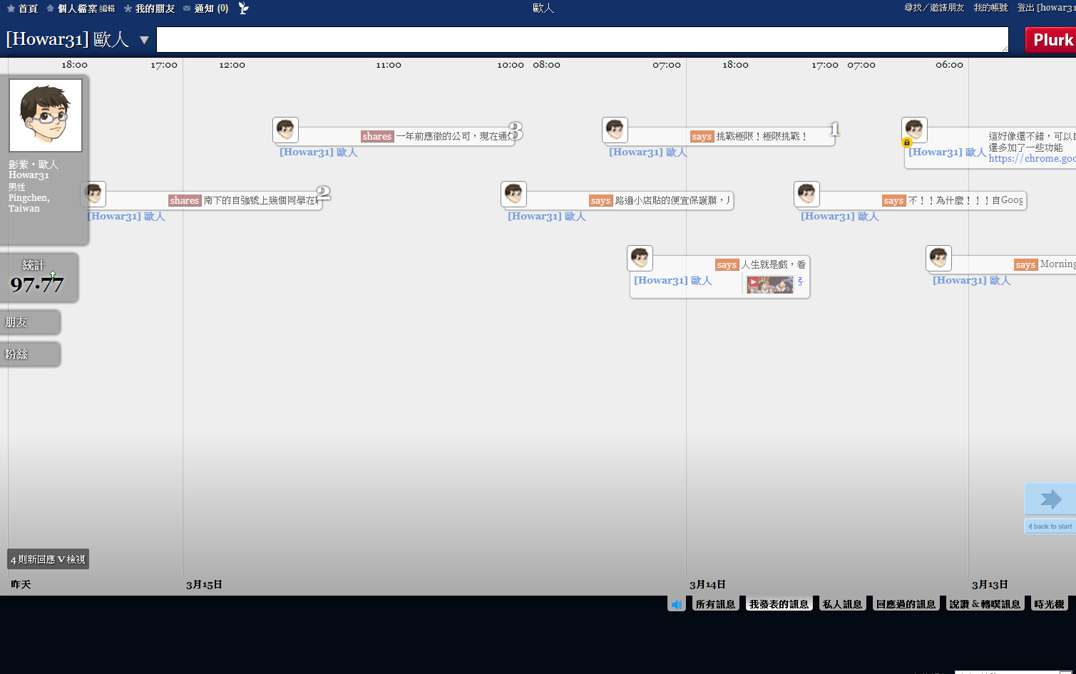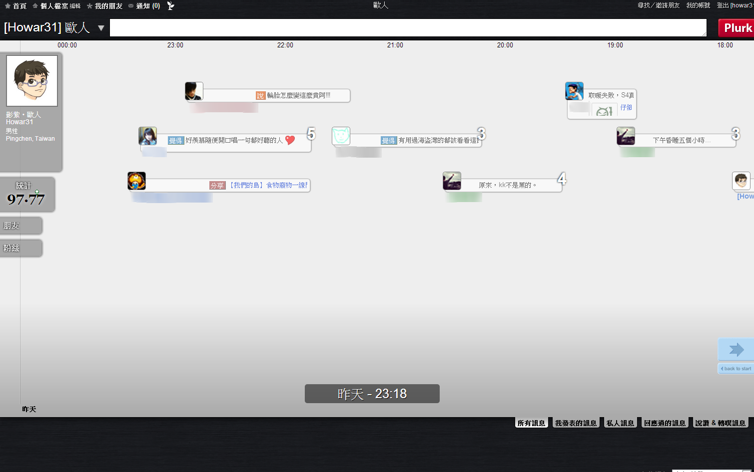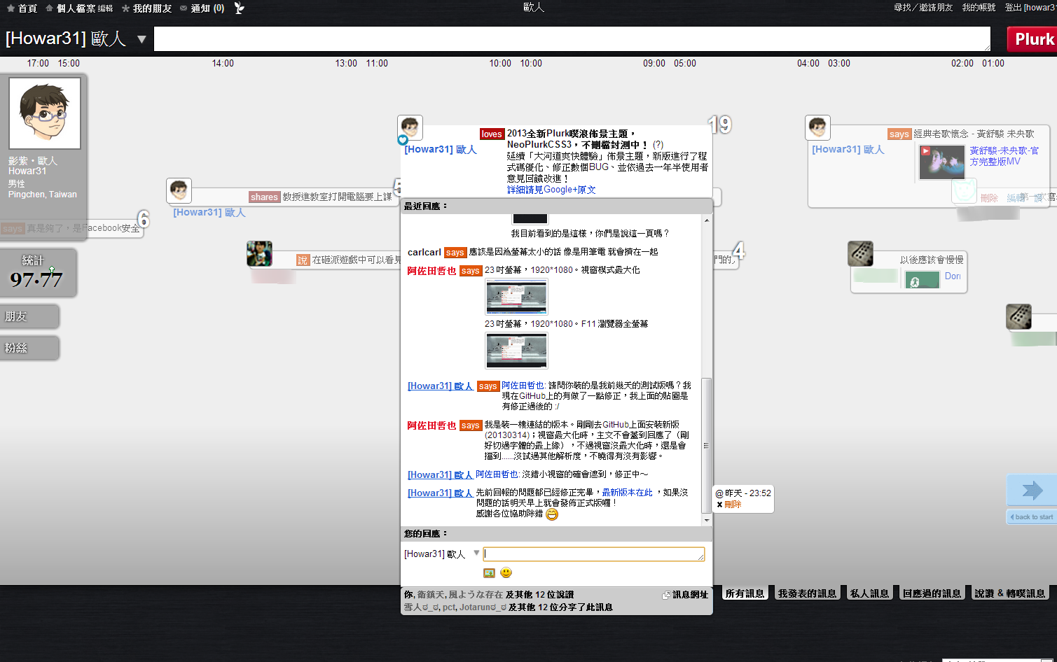 本人登入噗浪的畫面,這次改版把2009年版令人詬病的發噗框固定擺在上方,不再縮縮拉拉,此外河道中間下方放大噗浪時間方便閱讀