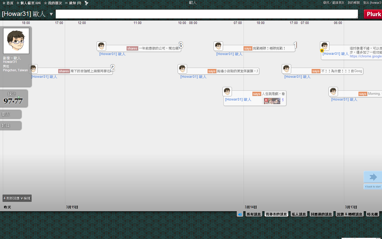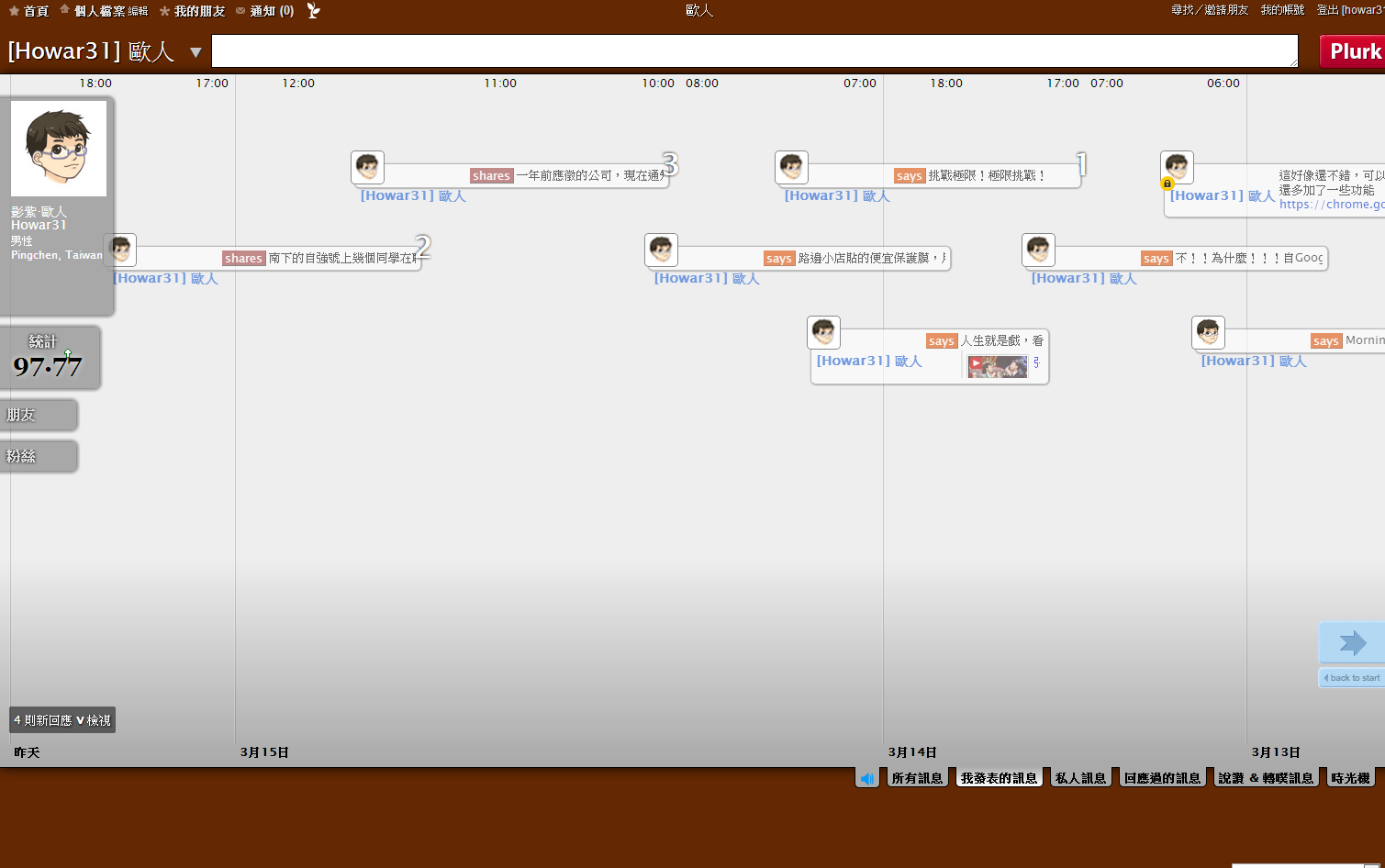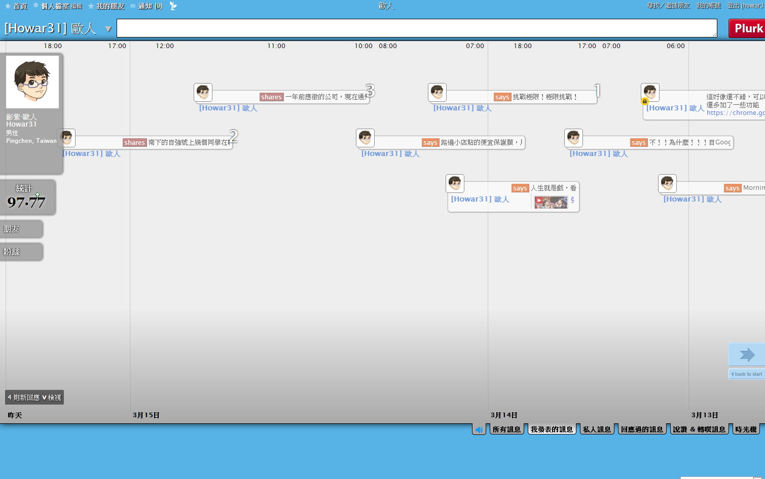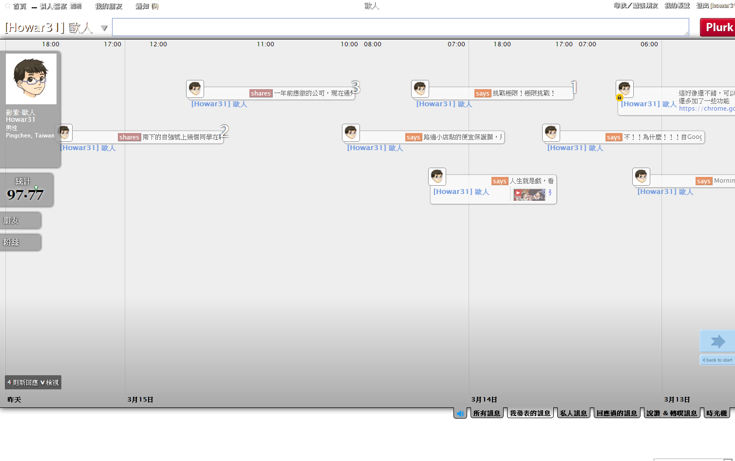 本人登入噗浪的畫面,這次改版把2009年版令人詬病的發噗框固定擺在上方,不再縮縮拉拉,此外河道中間下方放大噗浪時間方便閱讀