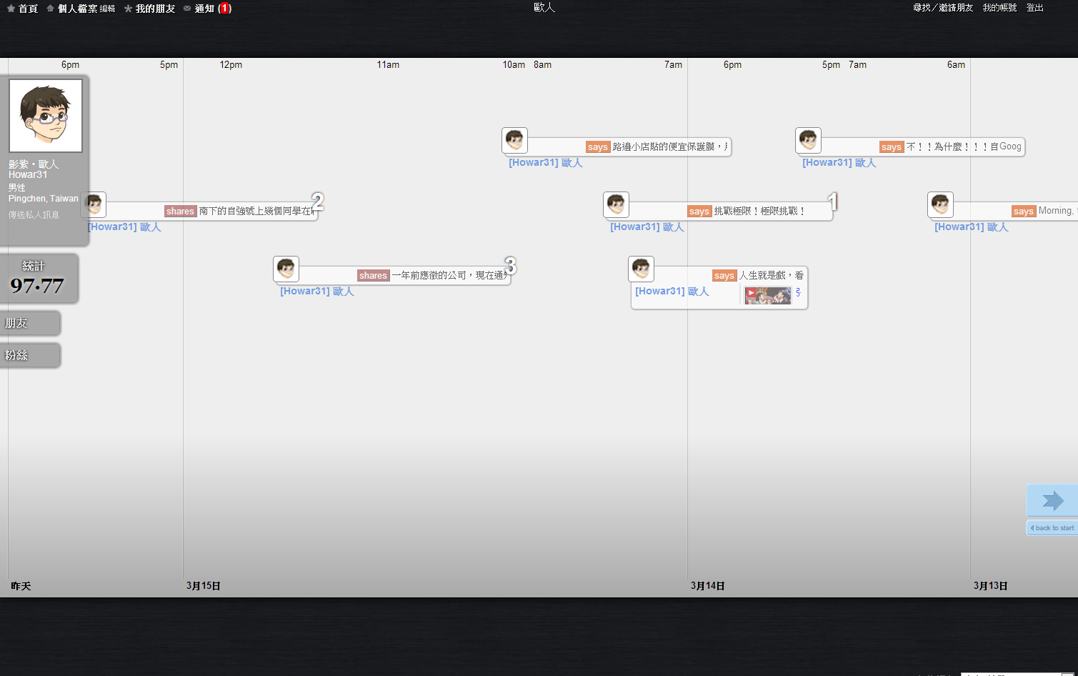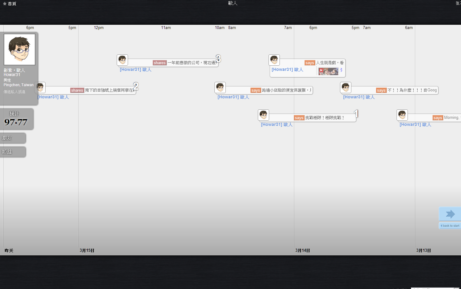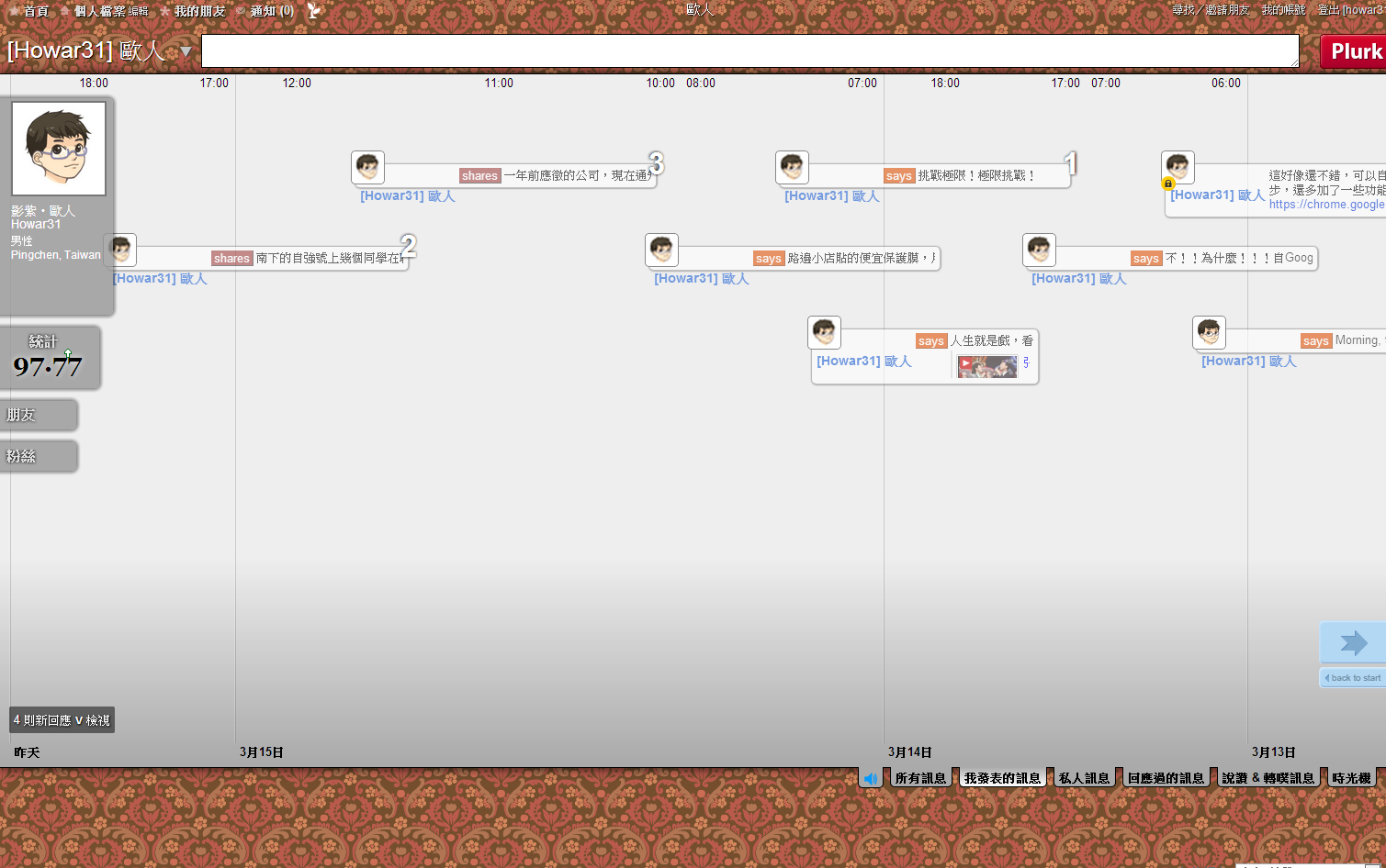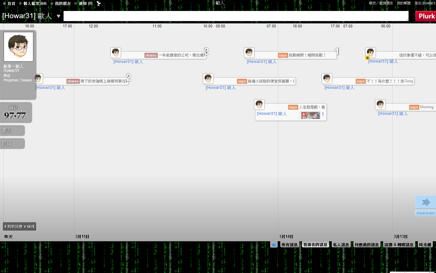 本人登入噗浪的畫面,這次改版把2009年版令人詬病的發噗框固定擺在上方,不再縮縮拉拉,此外河道中間下方放大噗浪時間方便閱讀