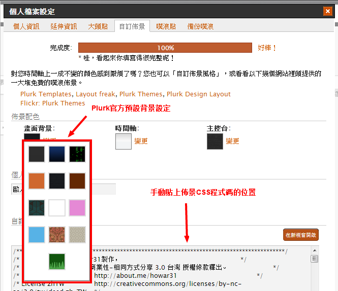 此外本佈景也與內建的噗浪背景設定相容,可以直接在選項中挑選自己喜歡的官方噗浪背景。另外如果要自行貼上CSS程式碼(例如自行從GitLab取得最新CSS碼),在圖中箭頭所指位置貼上即可套用佈景主題