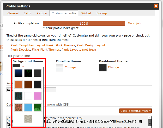 紅色圈框就是噗浪內建背景的設定,可以做各種搭配: