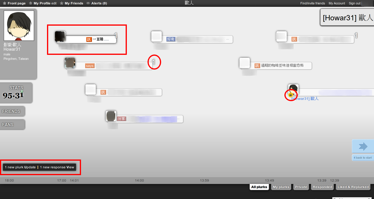 - 左上角方框是未讀的噗浪,會有加深陰影標示